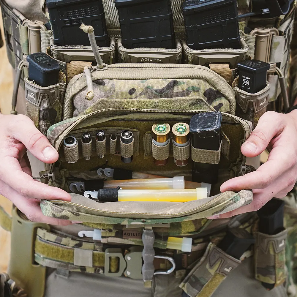 Agilite Rear Hanger er designet til at udnytte den ofte oversete rygplads på dine taktiske veste og plate carriers. Denne pouch gør det muligt at bære lægeudstyr, kommunikationsenheder eller andre missionkritiske småting uden at påvirke bevægelighed eller komfort. Produktet har en ergonomisk quick-detach system, som med ét træk giver adgang og muliggør hurtig fjernelse. Det indvendige rum har dobbelt sided loop-foret materiale samt medfølgende modulære indsæt med elastiske løkker, som hjælper med at organisere indholdet. Fronten er stivet, så pouch’en holder sin form, og et specialdesignet spændebånd (buckle) sørger for korrekt montering. Endvidere fungerer Rear Hanger som en form for lændestøtte, hvilket gør udstyret mere komfortabelt ved længerevarende brug, kørsel eller siddende positioner. Alt sammen pakket ind i slidstærkt Cordura-materiale med gode aftapningsmuligheder.