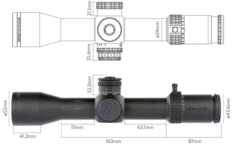 Delta Stryker HD 3.5–21×44 FFP er udviklet som det optimale valg til skytter, der har behov for noget mellem en LPVO og en fuldblods langdistancekikkert. Den kompakte formfaktor på kun 315 mm og en vægt på 805 gram gør sigtet velegnet til både taktiske karabiner og præcisionsrifler i DMR-konfiguration.