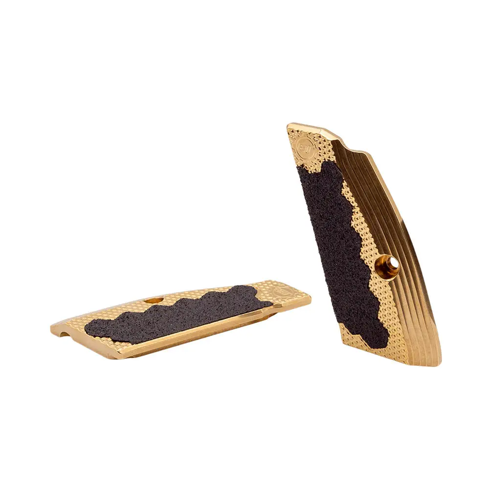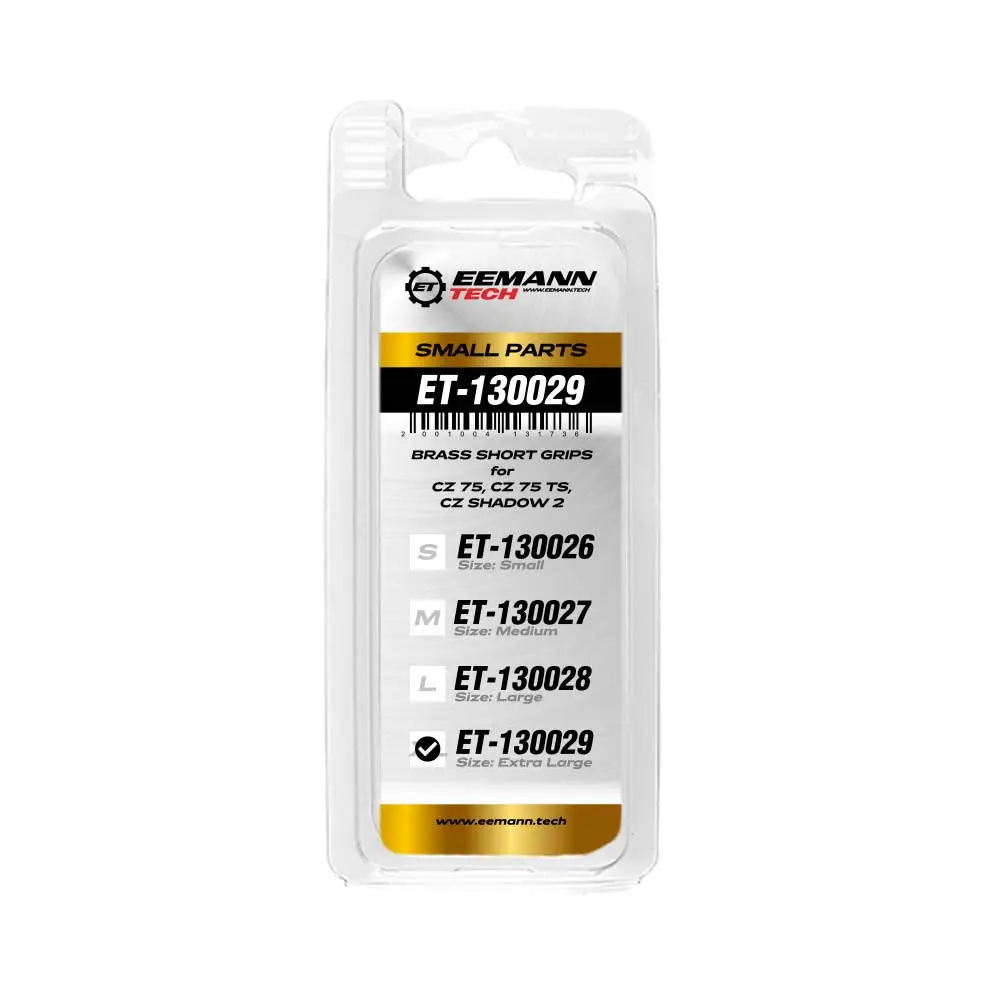 Eemann Techs Brass SHORT Grips er udviklet med konkurrenceskydning for øje. Hver gripplade er udført i massiv messing for at tilføre vægt i bunden af grebet — et effektivt og populært trick til at sænke tyngdepunktet, dæmpe mundingsflip og øge pistolens stabilitet ved aftræk. Den øgede masse gør opfølgende sigtninger og præcisionsarbejde nemmere, især under hurtige skift og lange skydepas.