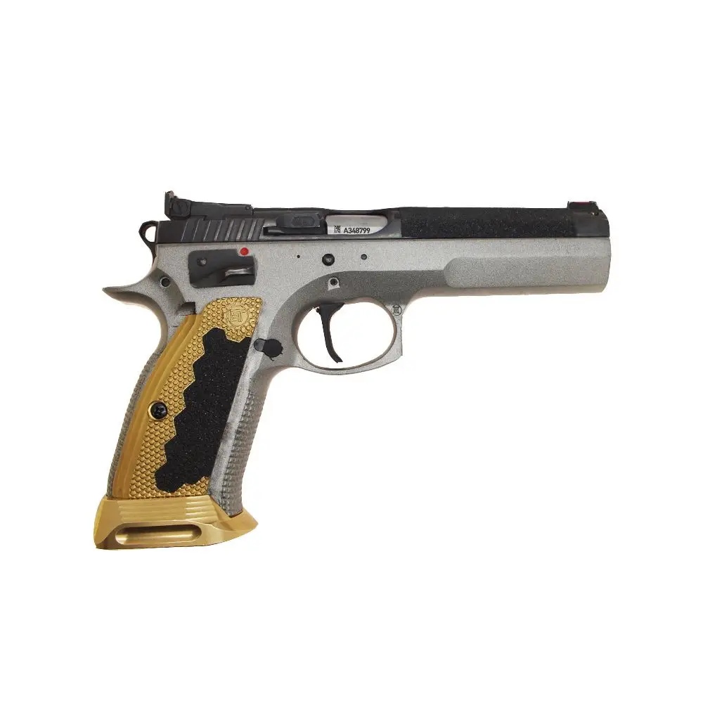 Den ekstra vægt (135 g) i bunden af pistolen sænker tyngdepunktet og mindsker bevægelse ved aftræk, hvilket giver en mere stabil platform og forbedret opfølgende skudpræcision. Magwellen er konstrueret til at passe i IPSC Standard Box med fabriks-sigte (OEM sights) og fabriksmagasin installeret — altså egnet til konkurrenceopsætninger uden at kræve ændring af sigtesystemet.