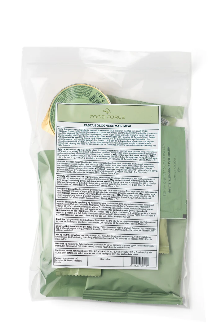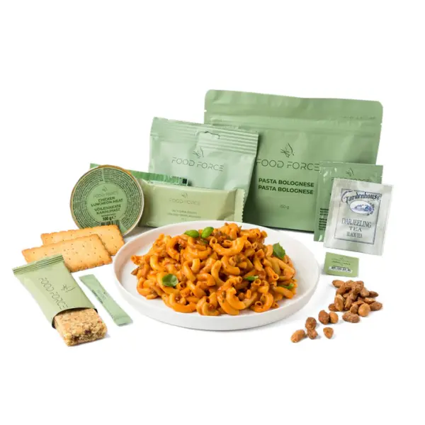 Food Force Pasta Bolognese Main Meal er et færdigsamlet måltidssæt, der kombinerer varm hovedret, snacks, drikkepulver og tilbehør – alt samlet i en kompakt og holdbar pakke.