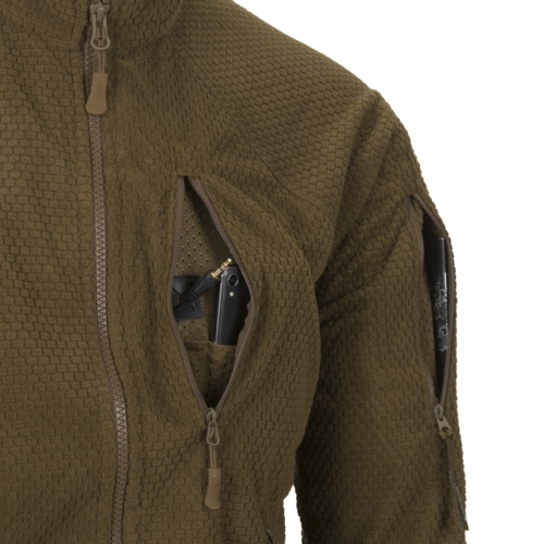 Alpha Tactical Fleece er udstyret med fem lynlåslommer, alle med YKK-lynlåse. To hoftelommer giver plads til hænder eller mindre udstyr, mens brystlommen har gennemføring til headset- eller kabel. Derudover er der to skulderlommer, som er placeret, så de er tilgængelige ved brug af vest eller rygsæk. Skulderlommerne har hook-and-loop-paneler til ID eller patches.