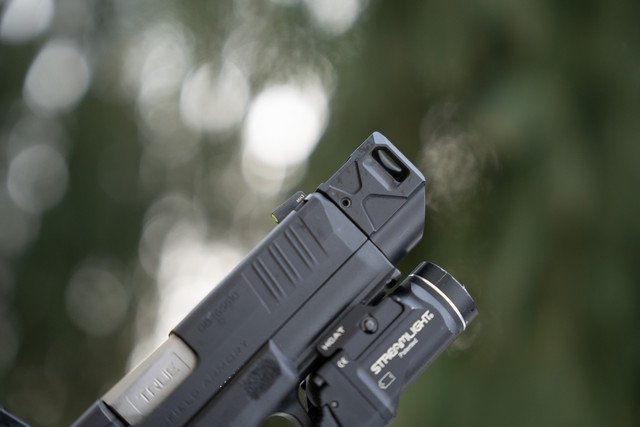 Designet er kompakt nok til at passe i de fleste open-bottom holsters, så du bevarer praktisk anvendelighed i dit setup.