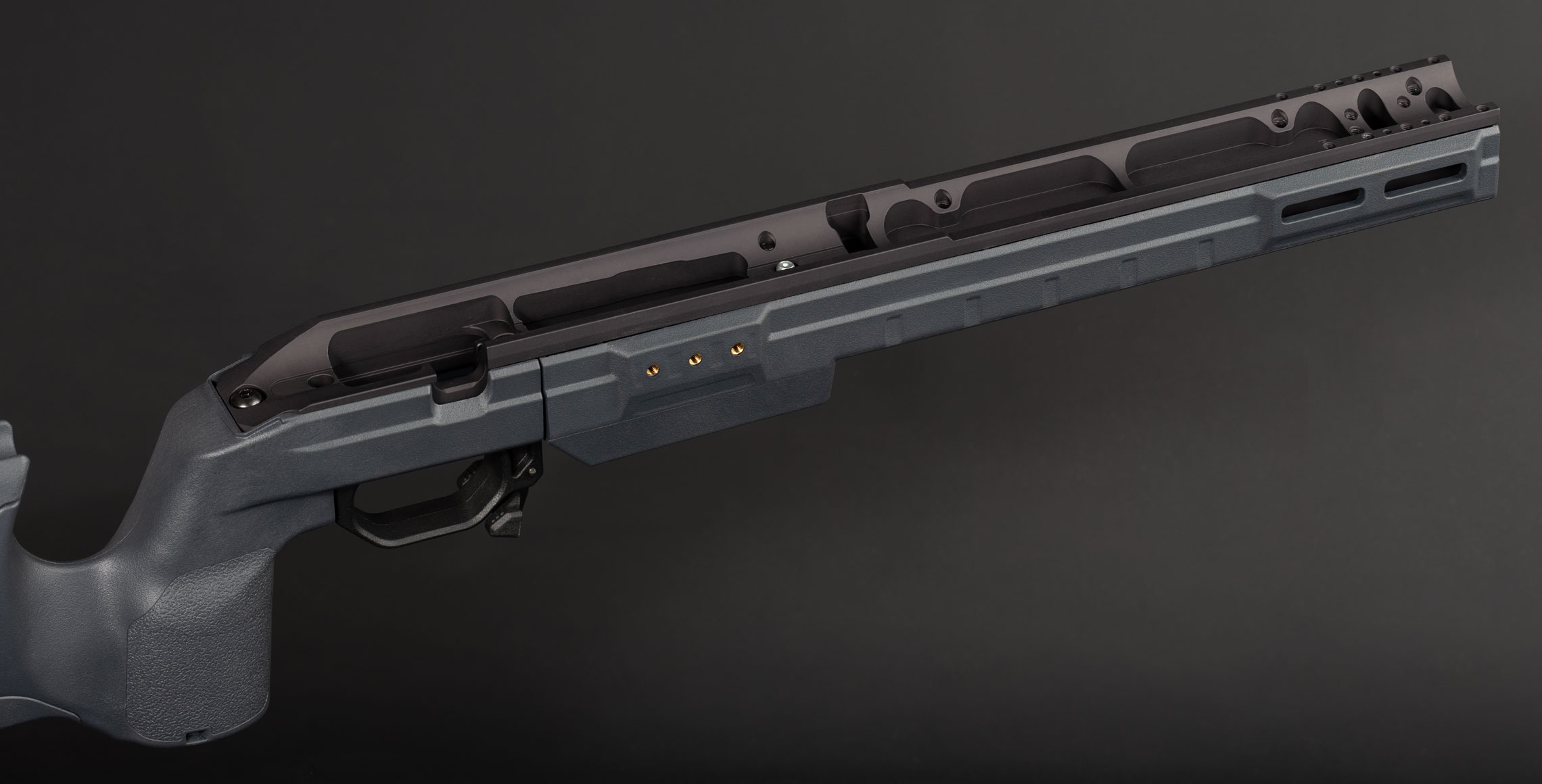 Kernen i systemet er en fuldlængde aluminium backbone, som giver maksimal stivhed fra lås til forende. Det eliminerer flex og sikrer en stabil platform, uanset om der skydes fra bipod, bag eller andre støttepunkter. Samtidig er bedding-området CNC-fræset med radius bedding, hvilket sikrer ensartet kontakt mellem lås og chassis – næsten som et custom-bedded setup.