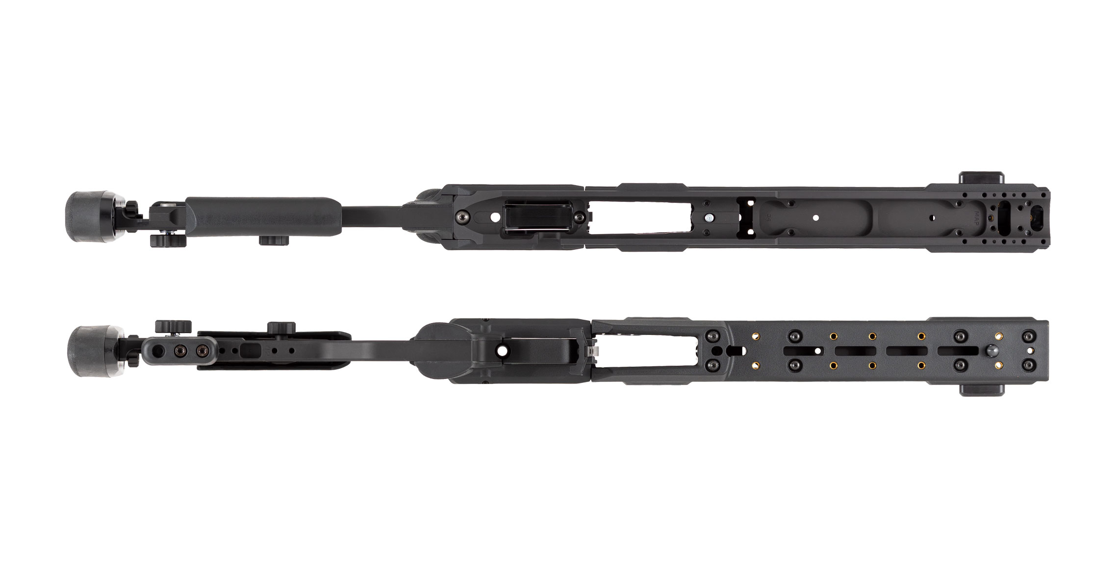 Bagenden er CNC-fræset i aluminium og giver en solid og stabil platform. Folding-versionen har et robust hængsel med låsemekanisme i hærdet stål, som kan konfigureres til både højre- og venstrefoldning.