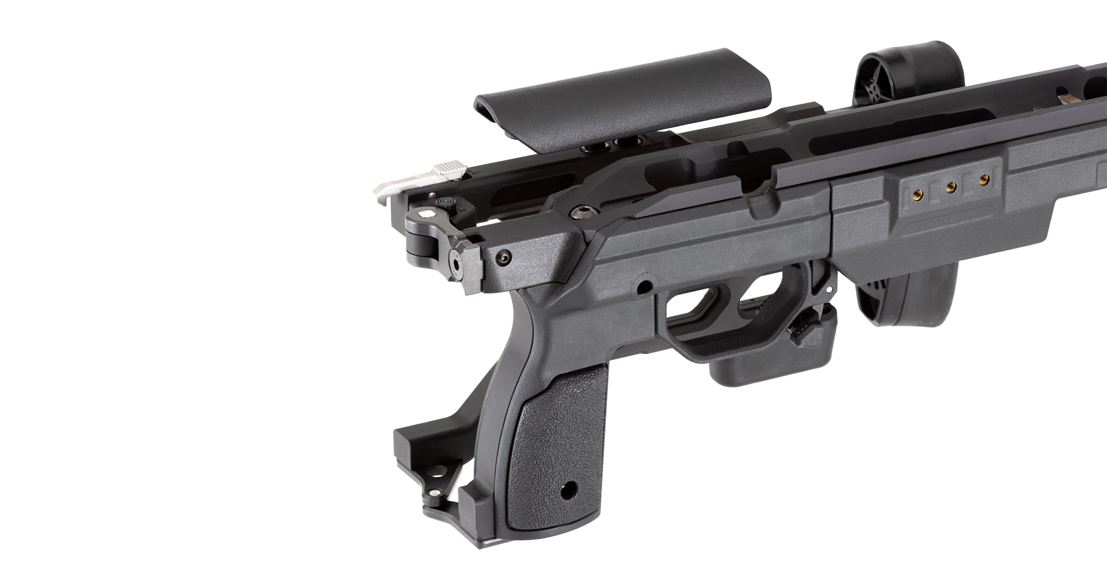 Forenden er udført i polymer for at isolere mod varme og kulde, samtidig med at vægten holdes nede. Den er udstyret med M-LOK interfaces og gevindhuller, hvilket gør det nemt at montere tilbehør som bipod, rails og QD mounts. Samtidig er der adgang til action-skruer uden at afmontere forenden.