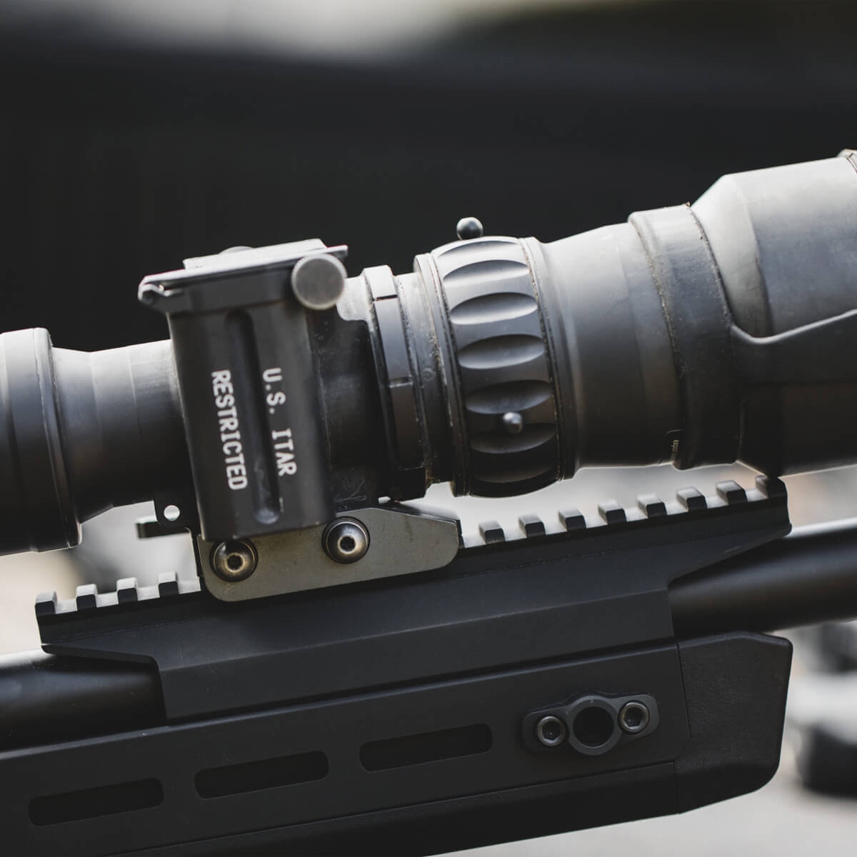 Konstruktionen giver en meget stiv og præcis montageflade, som sikrer ensartet nulpunkt og høj repeterbarhed – også ved gentagen af- og påmontering. Med over 7″ brugbar Picatinny-skinne er der bred kompatibilitet med de fleste gængse clip-on nat- og termiske enheder.