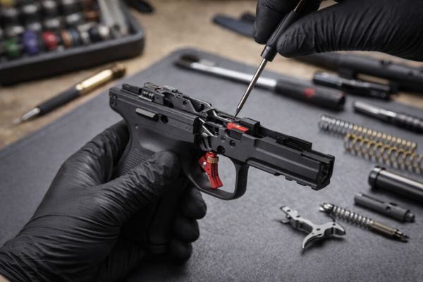Vi monterer blandt andet opgraderede aftræk, fjedre, interne dele og andre tunings- eller fjeder komponenter, der kan optimere våbnets funktion, aftrækskarakteristik og brugeroplevelse.