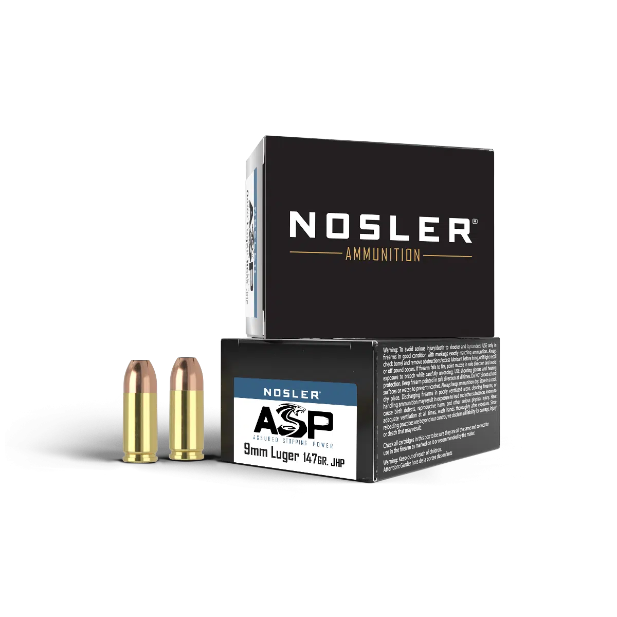 Denne variant anvender Noslers Assured Stopping Power-projektil i 147 gr og er standardtryk. Nosler oplyser samtidig, at ammunitionen kan være ladet i +P-hylstre, men at selve ladningen stadig er standard pressure.
