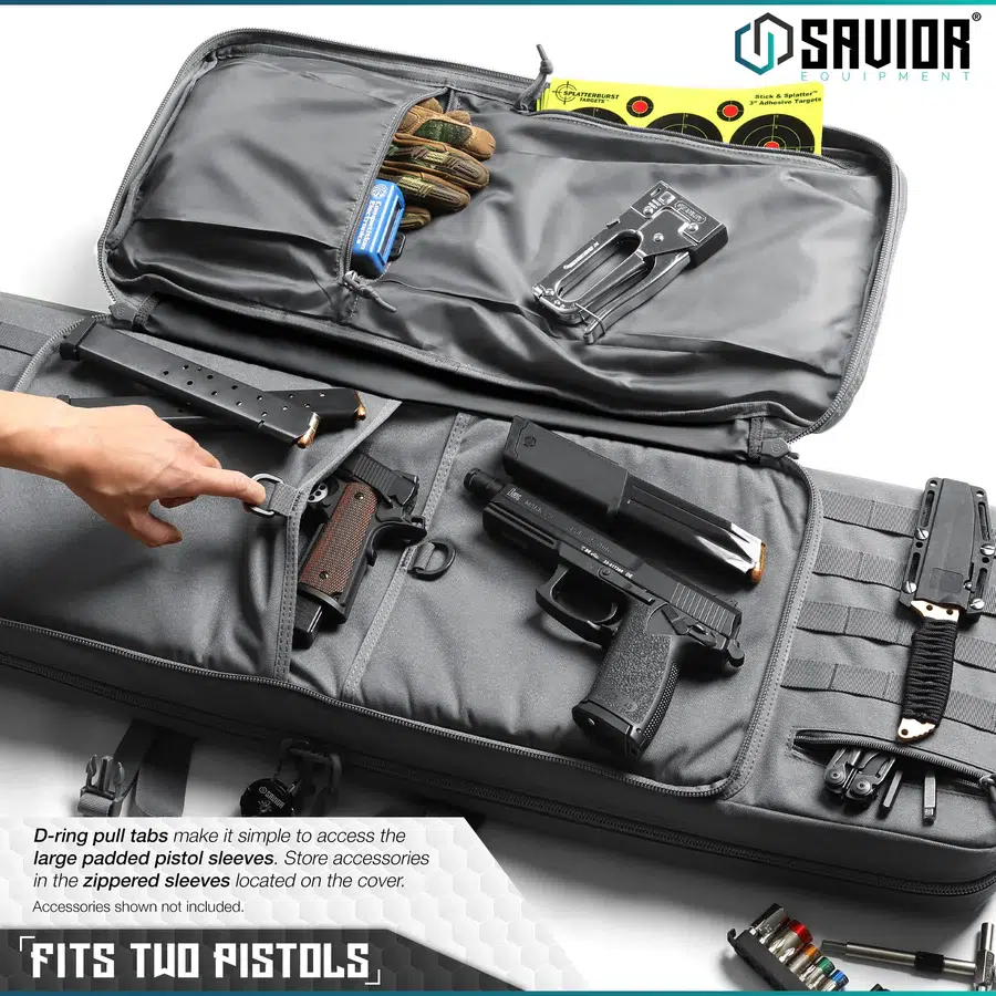 Det sekundære rum rummer to polstrede pistol-lommer samt to lynlåslommer til mindre udstyr. Udvendigt finder du tre rummelige tilbehørslommer til magasiner, høreværn, dokumenter og værktøj. Tasken kan bæres med håndtag eller som rygsæk takket være de justerbare, polstrede skulderstropper.