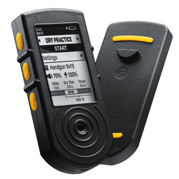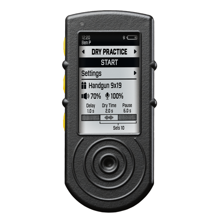 Timeren oplades trådløst eller via USB-C og leverer op til 7.000 sessions på én opladning. Konstruktionen er vand- og støvresistent, let og designet til regelmæssig brug – både på skydebanen og under daglig tørtræning.