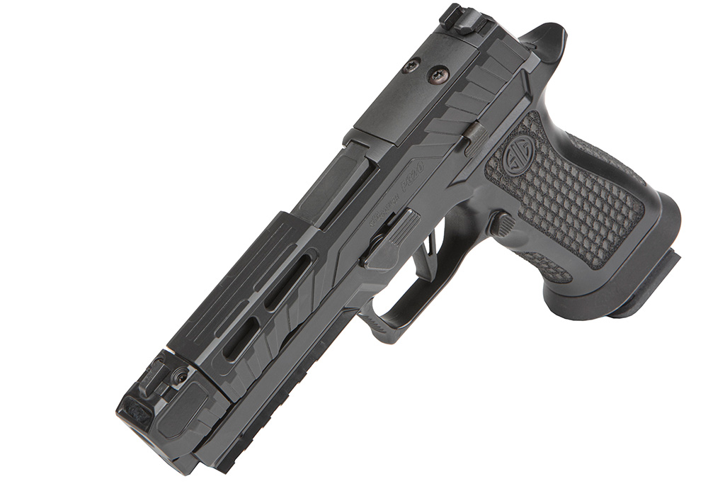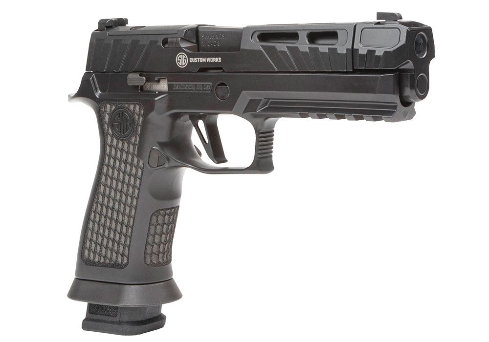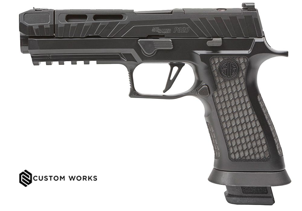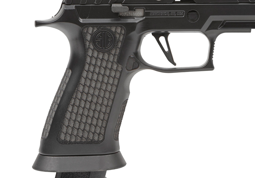 Grebet er SIGs TXG-modul med tungsten-infuseret polymer, som tilfører ekstra vægt og dermed bedre balance og kontrol. Overfladen er behandlet med Blackout Cerakote og lasergraveret tekstur, der giver et sikkert greb uden at være aggressivt.