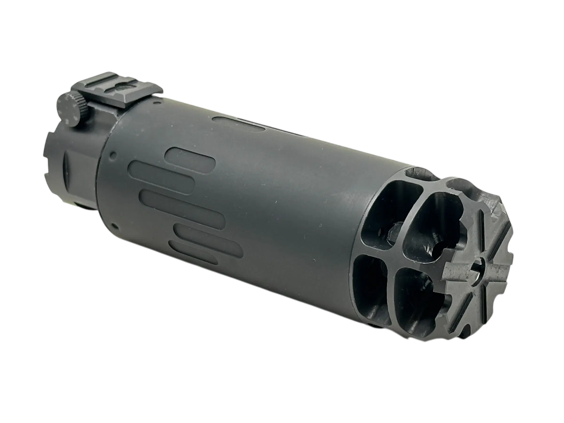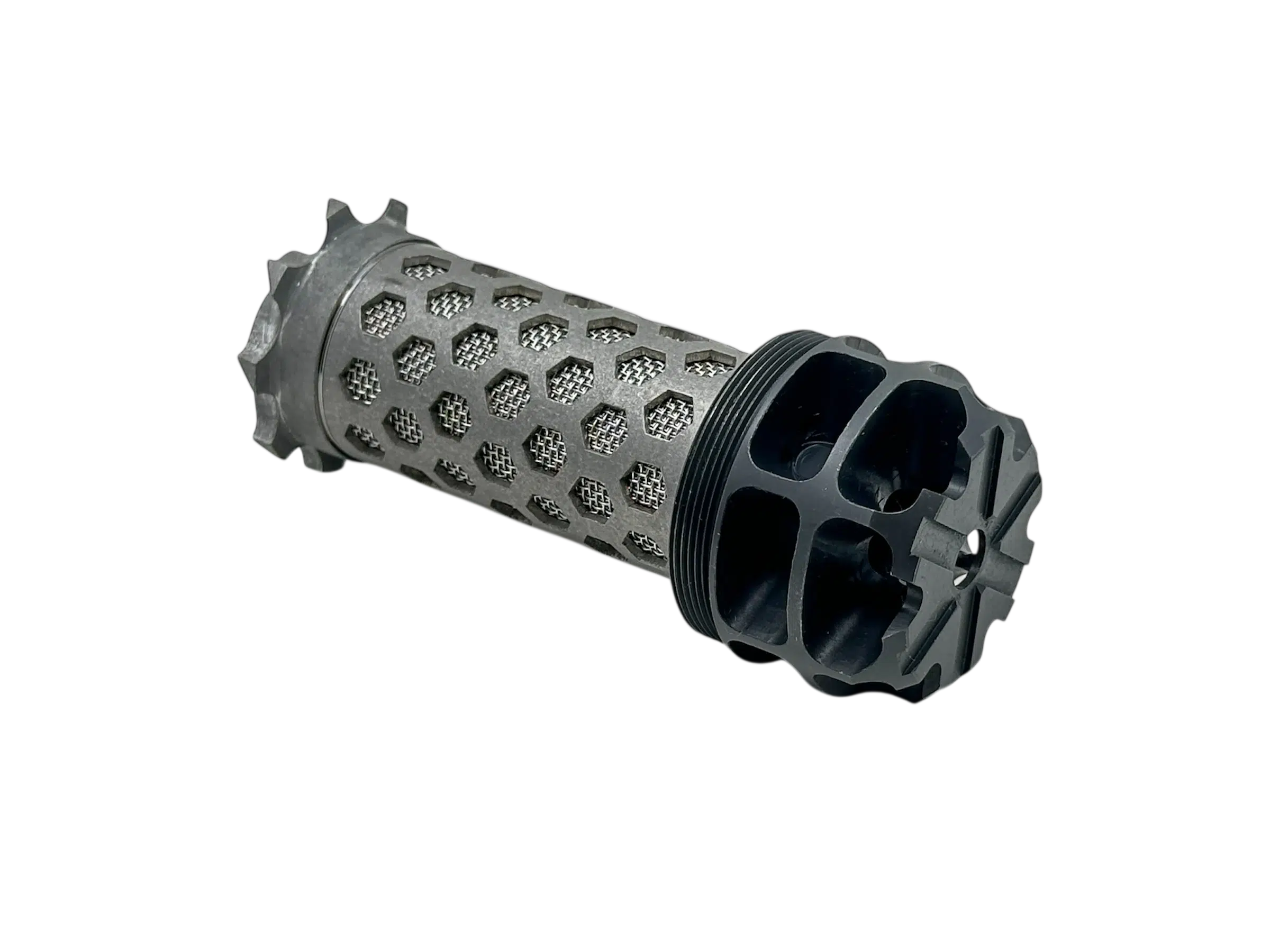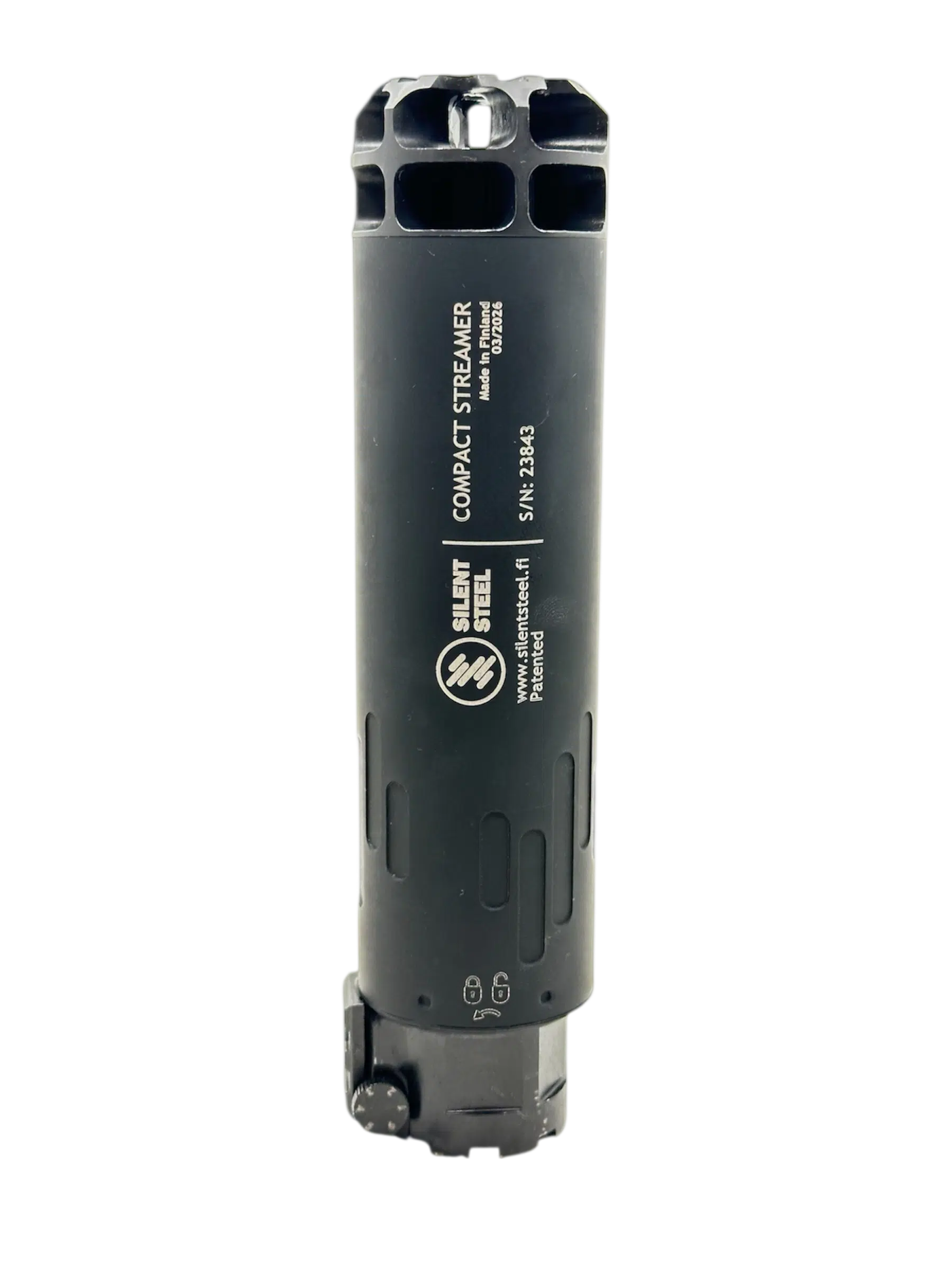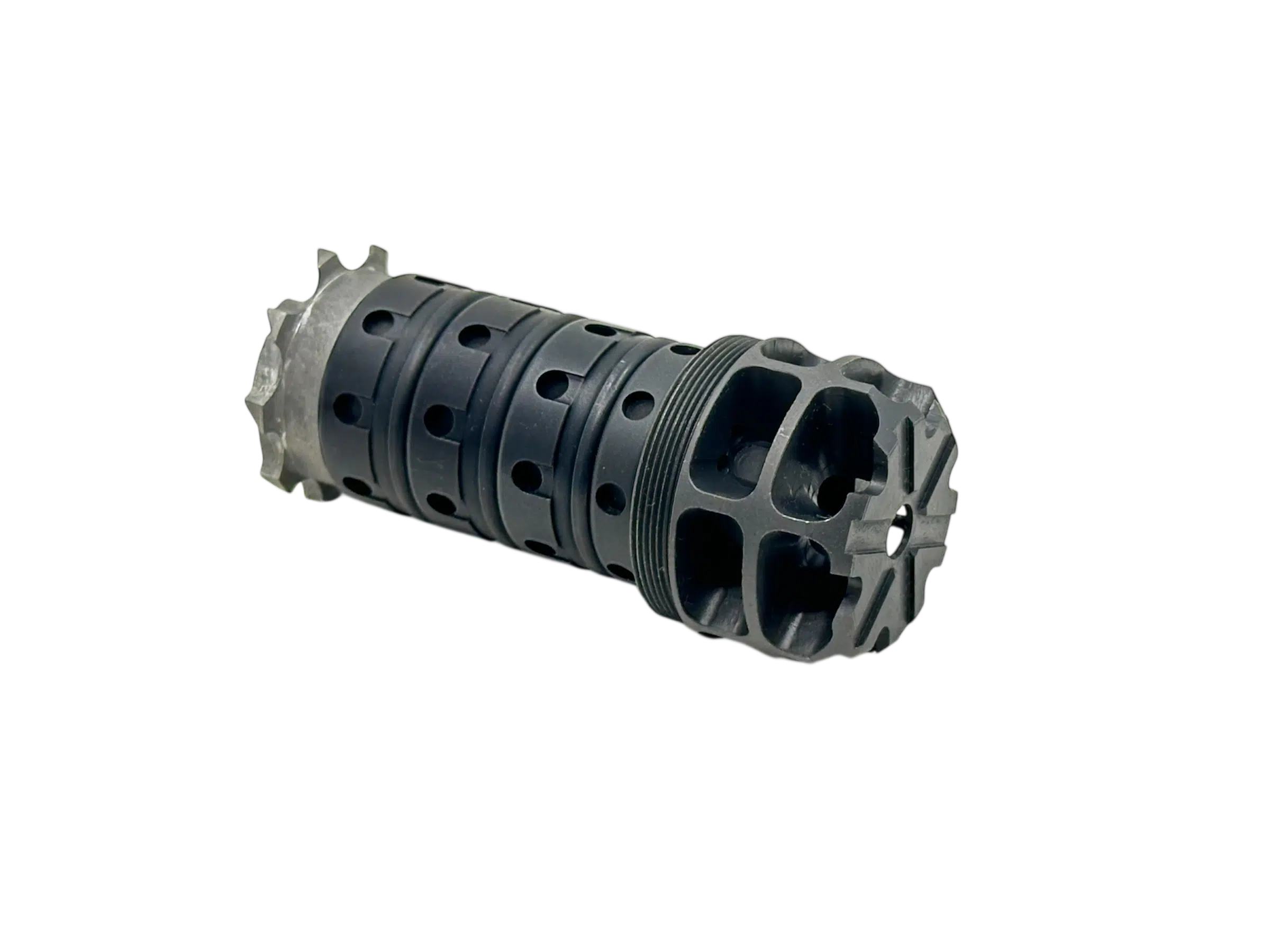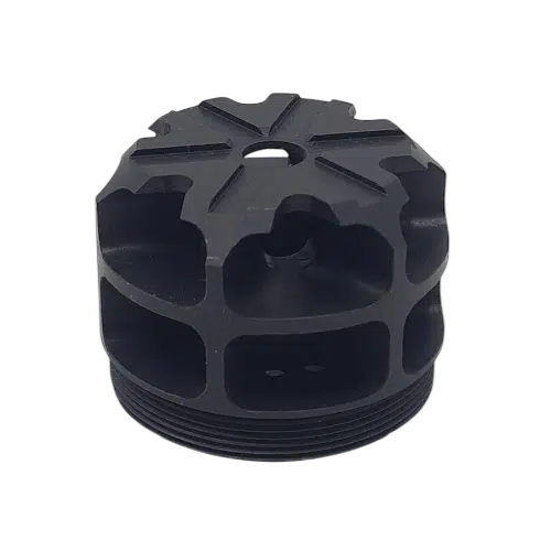 Silent Steel FlowComp er ikke en traditionel mundingsbremse – den er designet til at blive monteret på ydersiden af din Silent Steel dæmper som erstatning for frontkappen.
