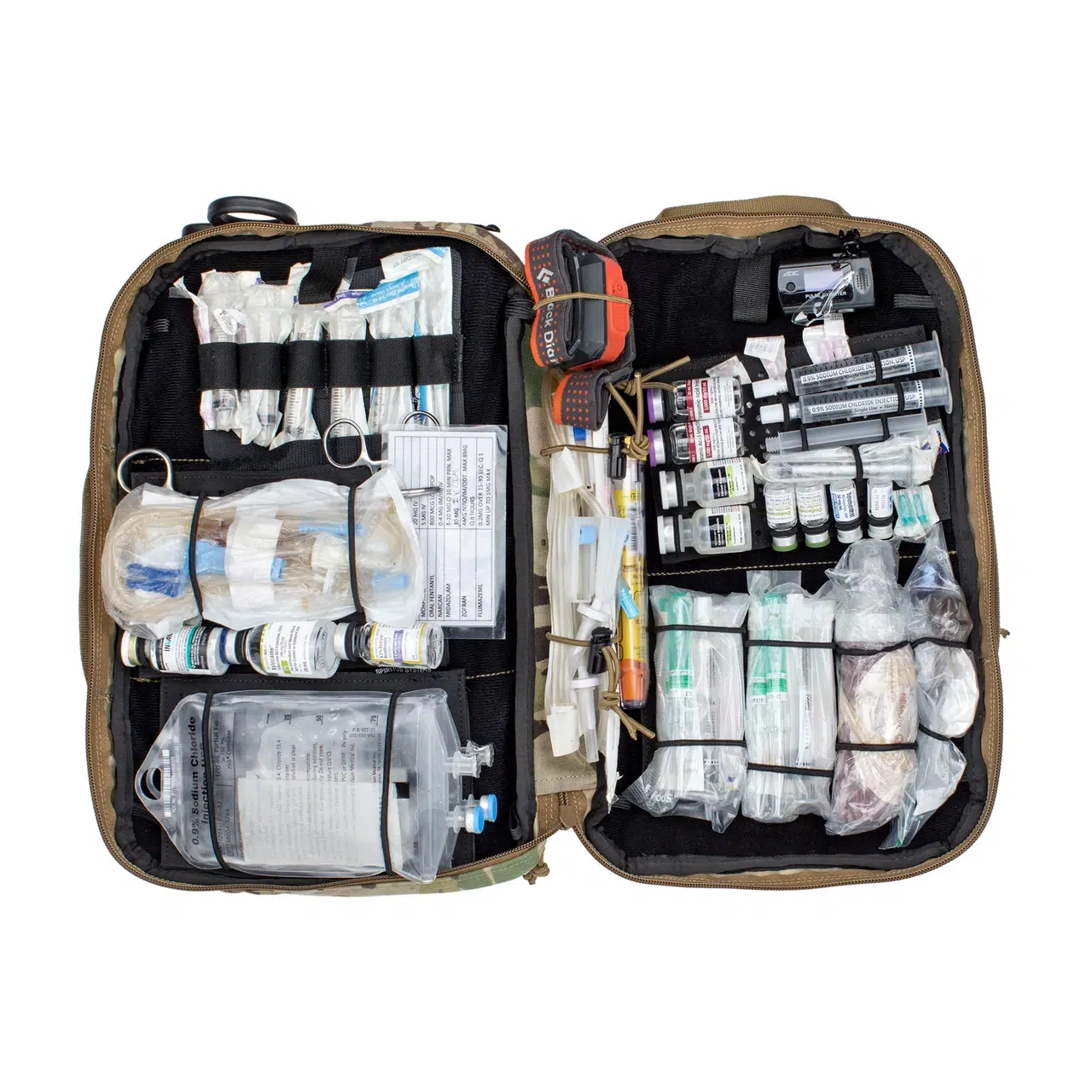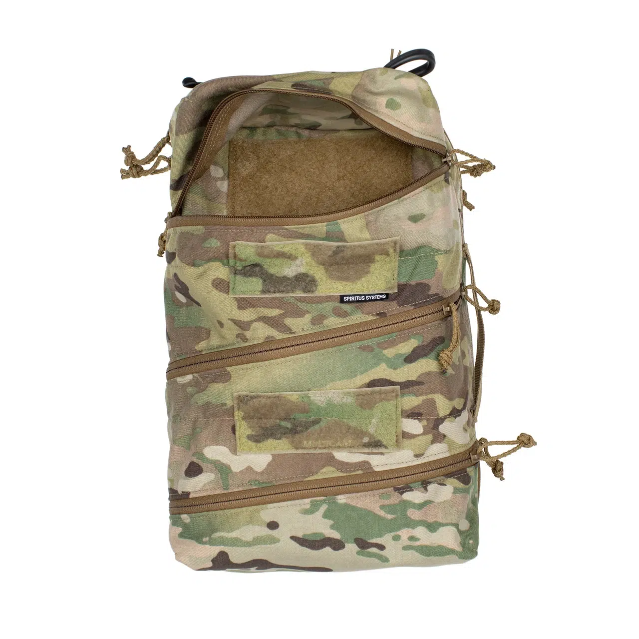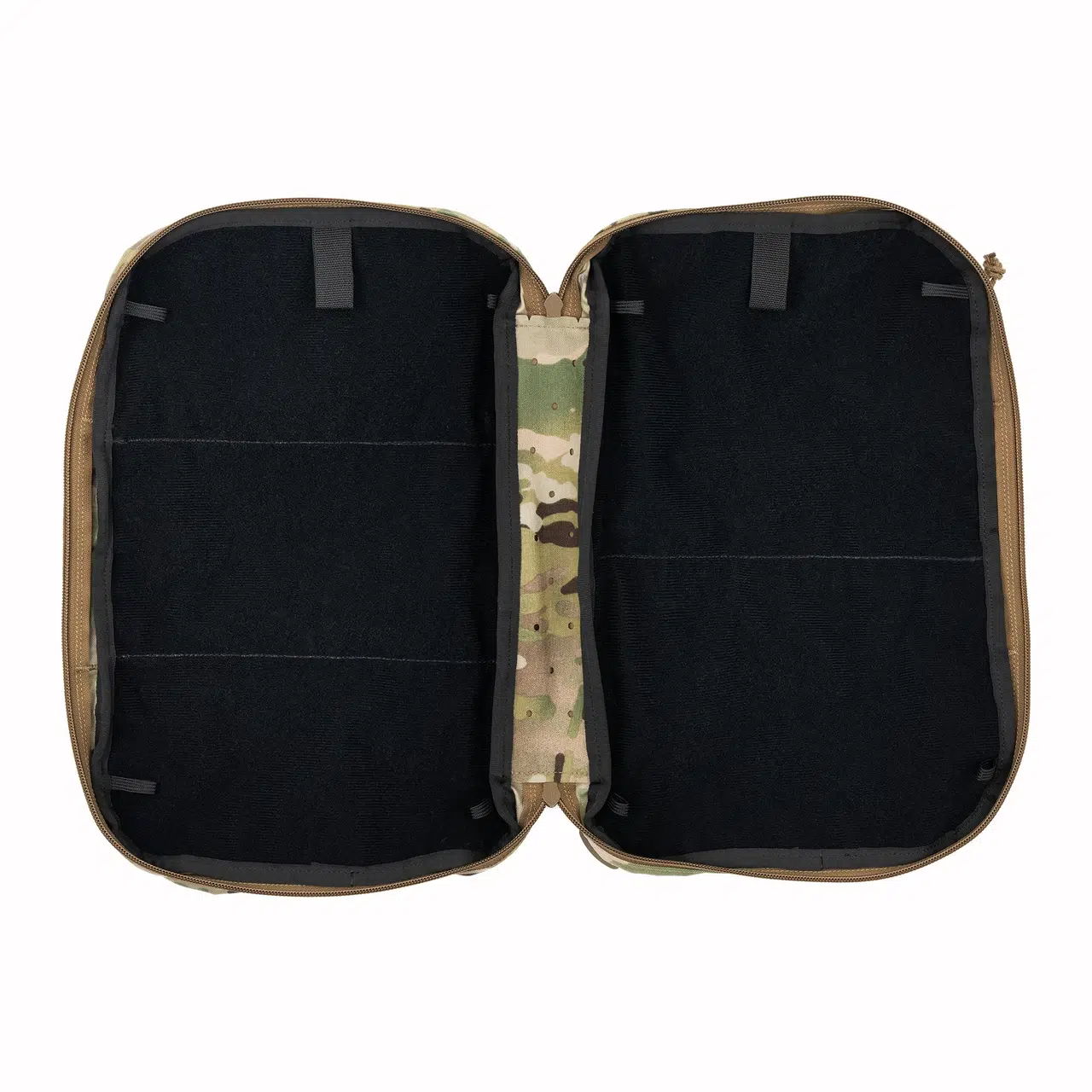 Hovedrummet er lavet i et clamshell design, som åbner helt op og giver fuldt overblik over dit setup. Indvendigt finder du store velcro-flader, så du kan tilpasse tasken med inserts og organisere dit medic gear præcis, som du vil.