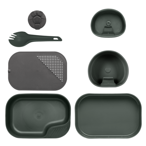 Sættet indeholder tallerken/skål med låg, to foldbare kopper i forskellige størrelser, spork (kombineret ske/gaffel/kniv), skærebræt med si-funktion samt en tredelt krydderishaker. Det gør Camp-A-Box Complete velegnet som ét samlet måltidssæt – uden behov for ekstra grej.